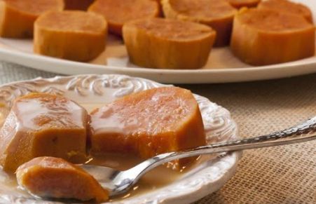 Try serving this delicious dish with its own syrup and drizzled with a little sweetened condensed milk. This recipe can also be made with pumpkins or squash instead of the sweet potatoes. You can eat this dish warm or you can let it cool, refrigerate it and eat it cold. It will keep in the refrigerator, covered, for a week.