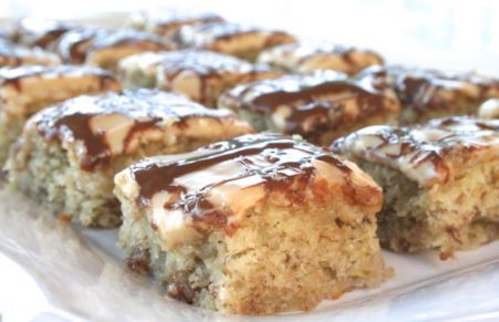 Moist Banana Bread Bars with Peanut Butter Frosting & Nutella Drizzle