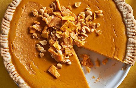 Add harvest flavor to pumpkin pie with mashed sweet potatoes. Brown-sugar-coated cheese crackers and peanuts make for an easy yet elegant topper.