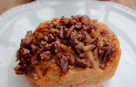 A sweet and creamy sweet potato dish with a cinnamon pecan topping.