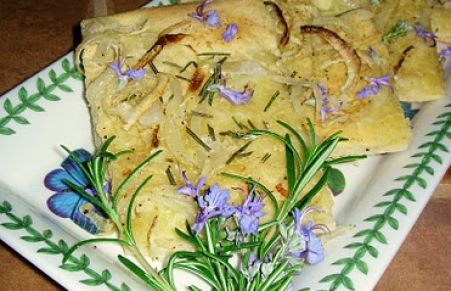 A wonderful recipe for a traditional Italian Focaccia. I have added fresh rosemary which happens to be in bloom now, adding the flowers to the top makes for a pretty presentation.