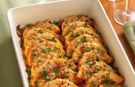 Thinly sliced butternut squash layered, brushed with garlic butter, covered in breadcrumbs and Parmesan cheese, and baked into a beautiful gratin.