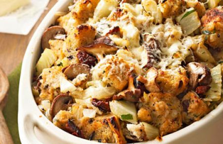This dressing is so flavorful thanks to sautéing the fennel and using olive bread. Mixed with sundried tomatoes and mushrooms and topped with Parmesan cheese, you won't be disappointed!