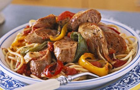 Choose sweet or hot turkey sausage to roast with the sweet peppers, onion, fennel, and tomato. Serve the delicious medley over spaghetti.
