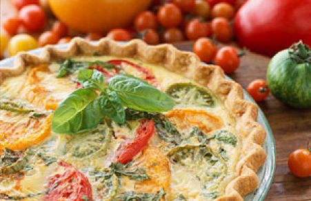 Summer's fresh tomatoes lend color and flavor to this cheesy quiche that makes a light dinner or lunch idea.