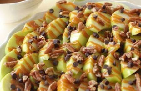 Green apple slices drizzled with caramel sauce and then sprinkled with mini chocolate chips and chopped walnuts.