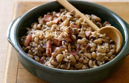 Hoppin' John, also known as Carolina Peas and Rice is a peas and rice dish served in the Southern United States. It is made with black-eyed peas and rice, chopped onion, sliced bacon, and seasoned with salt.