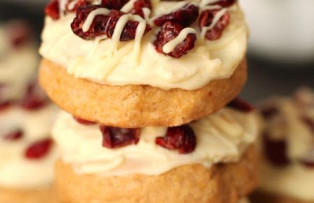 This pretty cookies are topped with cranberries and white chocolate cream cheese frosting. Perfect for the winter holidays, or valentine's day.