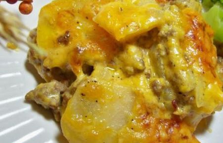 Sliced potatoes in a delicious creamy sauce on the bottom then topped with a ground beef mixture. Our family really likes this dish, so much so you'll see it on our dinner table at least once a month!