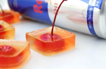 Vodka red bull jello shots topped with a cherry on top! These are always a big hit for a house party!