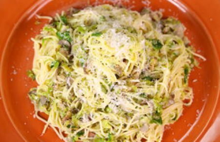 Angel Hair with Bacon, Brussels Sprouts, and Mushrooms