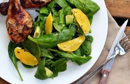Honey Garlic Chicken Drumsticks with Spinach, Avocado and Orange Salad