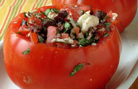 Fresh herbs, olives, and feta cheese adorn these stuffed and broiled tomatoes. Cut the saturated fat by using fat-free feta cheese. This dish works as a small lunch or a side.