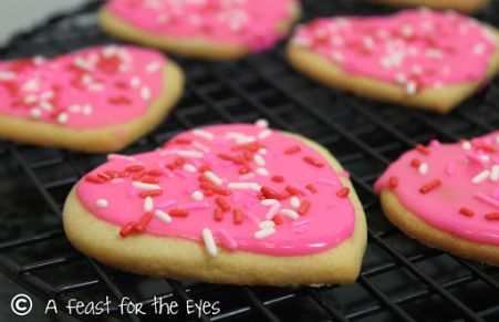 I have been baking this recipe for sugar cookies for 30 years, and it's my my absolutely favorite. I think it's the powdered sugar that makes these extra tender. Sometimes, I frost (or pipe) these with butter cream icing, but now that I've found an easy glaze frosting, it's less work and looks pretty, too. Recipes comes from Betty Crocker. Please click on the recipe source to see how I made these on my food blog "A Feast for the Eyes".