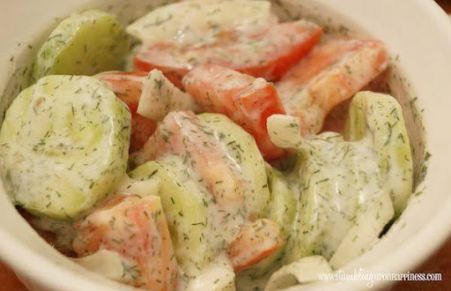 Sliced cucumbers, tomatoes and onions tossed in a creamy yogurt mixture seasoned with lemon juice, dill and a little salt. Yum!
