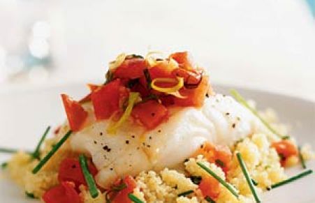 The whole family will live this delicious Oven-Roasted Sea Bass with Couscous and Warm Tomato Vinaigrette recipe.