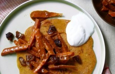 These crepes have the perfect balance of sweet and spicy flavors; a chickpea-flour crepe, with cilantro, turmeric and cayenne, is topped with a combination of stewed carrots and sweet dates.