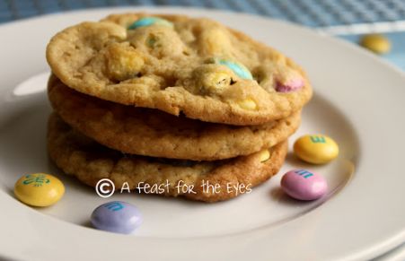 I've lost count of how many recipes claim to be "the very best" chocolate chip cookie. I've got a few different versions on my food blog-- and they are all good. This is the first time I've tried adding vanilla pudding mix into the cookie dough (and I've seen this on many food websites). You know what? These are one of THE BEST chocolate chip cookies I've ever made! When baked and cooled, they become thin, with crispy edges. The center of each cookie has a soft and chewy texture. I hate to admit it, but the cookie dough is highly addictive. Since it's spring time, I used pastel colored M&M chocolates, but traditional semi-sweet chocolate chips work great, too. I adapted the recipe to make 3 1/2 dozen (I would've had four dozen, but many teaspoons were scooped into the dough and eaten raw.) Recipe very slightly adapted from "The Very Best Baking". Please click on the recipe source to see how I made these, on my food blog "A Feast for the Eyes".