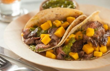 Mangoes make an appearance in both the sauce and garnish for these fajitas, adding plenty of sweet and tangy flavor. For a vegan version, substitute baked or grilled tofu for the steak.