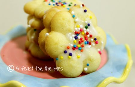 These cookies, with their touch of Fiori di Sicilia, are inspired by an Italian-American cookie made around Easter time. Although normally hand-formed, I was inspired to make these using my "Spritz Press". I decided to make a glaze (recipe from King Arthur Flour) that I drizzled over each cookie and then sprinkled with colored nonpareils. The Fiori di Sicilia is a baking extract that I buy from King Arthur Flour (online). It has notes of citrus and vanilla. You can, of course, use your own favorite extract-- almond, lemon, whatever you like. If you don't own a cookie press, you can use a pasty bag with a large tip to press out your cookies in whatever shapes you like. The traditional shape is more of a round/wreath. Cookie recipe adapted from Fine Cooking. Please click on the recipe source to see how I made these on my food blog, "A Feast for the Eyes".