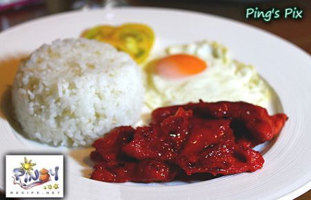 A popular and very savory Filipino dish with the Spanish name, Tocino (bacon, cured pork). Most often served for breakfast with steamed rice and fried eggs, but can be served as the meat for a later meal.