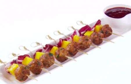 Make sure to have skewers to serve these beautiful meatballs with sweet mango and bitter radicchio, which balance and compliment this appetizer.