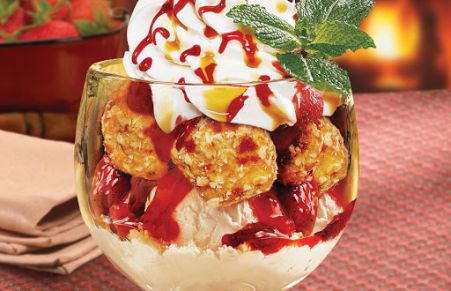 Tasty nuggets of creamy cheesecake lightly breaded and crisp fried. Served over vanilla bean ice cream with raspberry sauce.