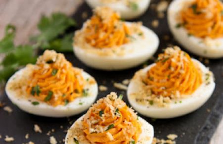 Sriracha Deviled Eggs with Garlic Toast Crumb Topping