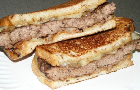 Pan-grilled ground beef patties topped with caramelized onions and swiss cheese on buttered and toasted rye bread.