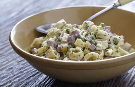 In a large bowl, combine the tortellini, ham, peas, cheese, green onions and parsley with the dressing and toss until evenly coated. Chill covered for at least 2 hours before serving.