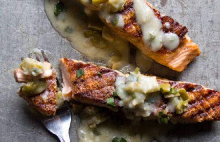Classic beurre blanc enhanced with ramps and chopped Cerignola olives makes a creamy, velvety sauce for grilled salmon.
