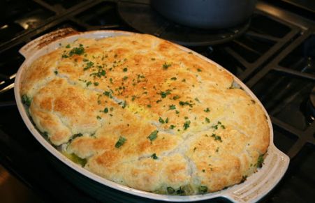 A creamy rich sauce with tender chicken and flakey biscuits to top it off. For more recipes follow me at @chefmarymoran on Twitter.