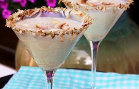 This sweet martini gets drizzled with white chocolate liqueur, and the glasses get rimmed with toasted coconut and honey. Great dessert drink!