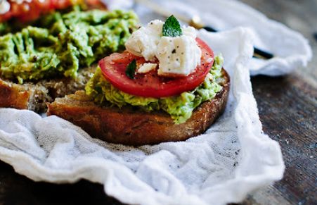 Healthy, hearty and delicious breakfast with smashed and seasoned avocado smeared on toast, topped with sliced tomato and goat cheese crumbles. Top with a fried egg, if you'd like!