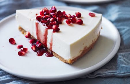 Looking for a slice of heaven? Try this decadent and delicious cheesecake drizzled with pomegranate syrup.
