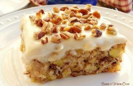 A delicious one bowl pineapple cake topped with a cream cheese frosting while it’s still hot. This Easiest Pineapple Cake is a one bowl wonder! Not only is it made easy by only needing one bowl to make it, there isn’t any butter or oil in the cake batter and yet it is extremely moist! The cream cheese frosting is put on the cake while it is still hot, the frosting seeps into the top of the cake, it’s incredible. This is a dense , moist, pecan, pineapple filled cake topped with a creamy cream cheese frosting your family will thoroughly enjoy! I didn’t have crushed pineapple but I did have pineapple slices. I took the slices out of the can and into my food processor and pulsed them until they were “crushed”. I put the crushed pineapple and it’s juice into the bowl and added the other cake ingredients to it. After all the cake ingredients were in the bowl, I mixed with an electric mixer just till the ingredients were combined. That only took about 3 minutes tops. I folded the chopped pecans (mine were more crushed) into the batter. Into the oven it went. About ten minutes before the cake was to be done I made the frosting. I topped the cake with the frosting right after I took it from the oven. The result? Pineapple cream cheese heaven! This is a definite keeper Kids! Enjoy!