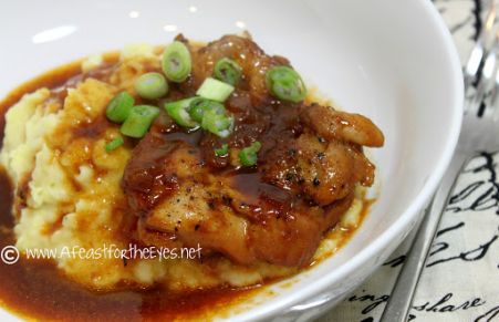 I don't drink whiskey. Never have, never will. However, I do like the way that whiskey makes flavorful sauces! That works for me. This recipe is adapted from "The Pioneer Woman Cooks". Instead of baking this recipe in the oven for 1-1/2 hours, I pressure cooked this in 10 minutes. The chicken thighs were tender, and the barbecue sauce had just the right balance of savory and sweet (from peach jam), with another layer of flavor from the whiskey. Served over creamy mashed potatoes, this is a great Fall/Winter way to capture the flavor of barbecue. I also proportioned this dinner for two servings, but you can easily double or triple the amount of chicken.