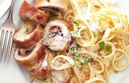 Chicken breasts rolled up with prosciutto, mozzarella, and fresh basil, seared and baked, sliced into medallions and served on top of fettuccine with a butter and garlic sauce.