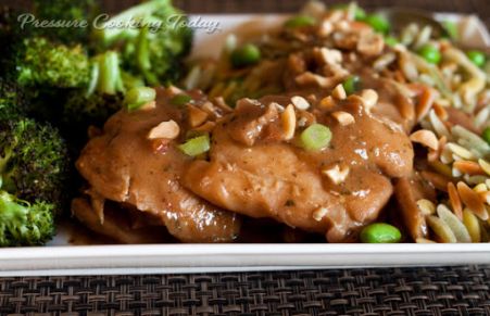 You have to try this quick and easy Pressure Cooker Thai Chicken Thighs recipe! Fork tender boneless, skinless chicken thighs in a luscious Thai peanut sauce cooked in the pressure cooker in a fraction of the time it takes to cook in the slow cooker.