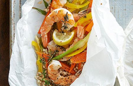 A parchment packet steams the veggies and shrimp, leaving everything brightly colored and extra-crunchy.