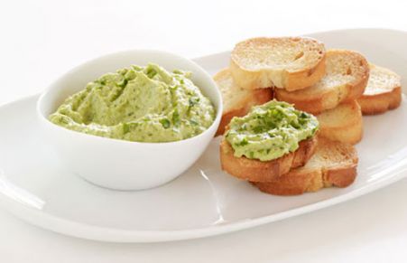 Combine freshly shelled peas with garbanzo beans, herbs and spices in the food processor to make this easy crostini topper that's rich with flavor and color.