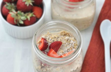 I make 5 of these jars at a time for easy breakfasts all week. They are great to take to work as well. The strawberries should be fine in the jar for a night or two, but if you plan to make more than two at a time, add the strawberries in right before you eat it. Enjoy!