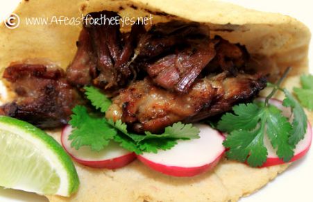 Pork braised with lime, orange juice and aromatics, then pulled, and broiled until tender inside, and crunchy on the outside. A delicious filling for tacos, burritos or tamales.