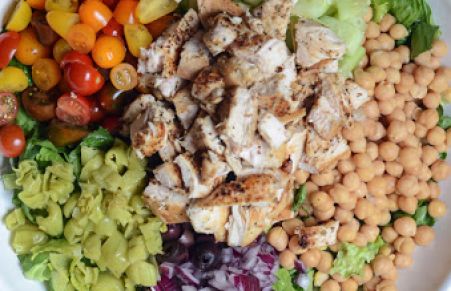 An easy, flavorful salad with mediterranean-spiced chicken, garbanzo beans, and a creamy feta dill dressing that will keep you going all day. Stuff into a pita or flatbread for a souvlaki-style wrap!