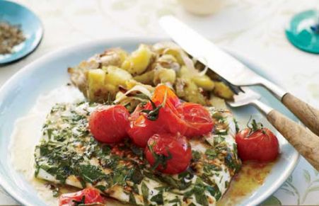 Smashed fingerlings and tomato butter pair great with grilled halibut.