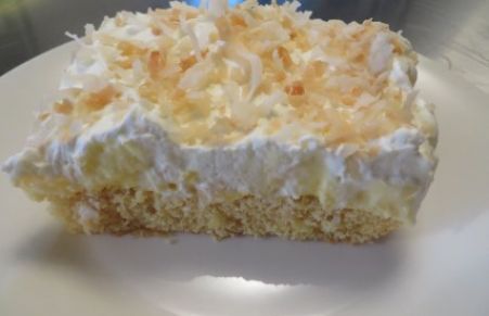 A creamy 3 layer Dessert with hints of Pineapple and topped with Toasted Coconut.