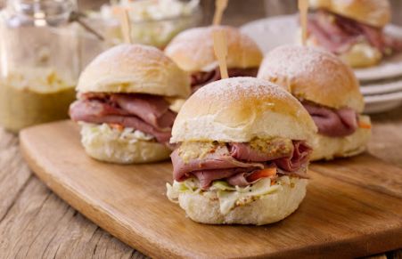 Corned Beef Sliders on Potato Rolls with Cabbage Slaw and Guinness Mustard