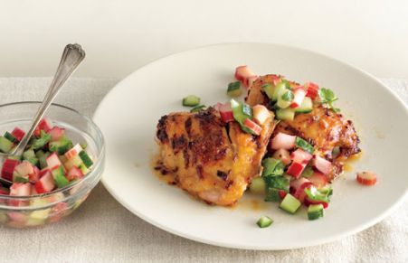 Spicy Chicken Thighs with Rhubarb Cucumber Salsa