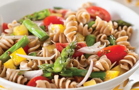 A twist on a traditional pasta salad, this recipe has an oil and vinegar based dressing and includes tender asparagus and tomatoes.