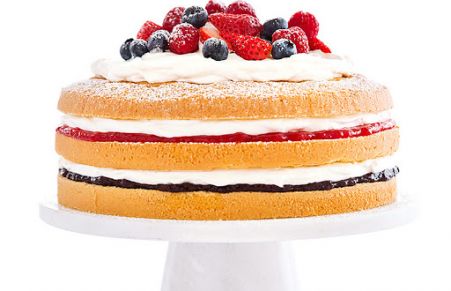 For a patriotic-looking cake that makes use of summer’s berry bounty, we start with fresh blueberries, strawberries, and raspberries. We use pectin to make both a sweetened blueberry filling and a raspberry-strawberry one. After chilling, we spread the berry mixtures between layers of chiffon cake along with lightly sweetened whipped cream. A final crown of fluffy whipped cream and a pile of fresh berries and this cake is dressed to impress.